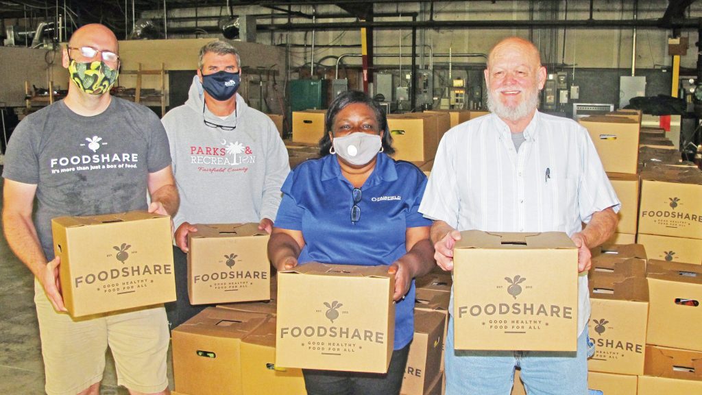 “Much like the distribution we’re doing here today, Foodshare would send a truck load of fresh fruits and vegetables into a Fairfield hub where a group of volunteers would sort the produce, pack the boxes and distribute them,” he said. “The difference between what we’re doing here today – distributing free boxes – and what is done in a Foodshare hub, is that all the boxes distributed through a hub are purchased by the people who come to pick them up.”