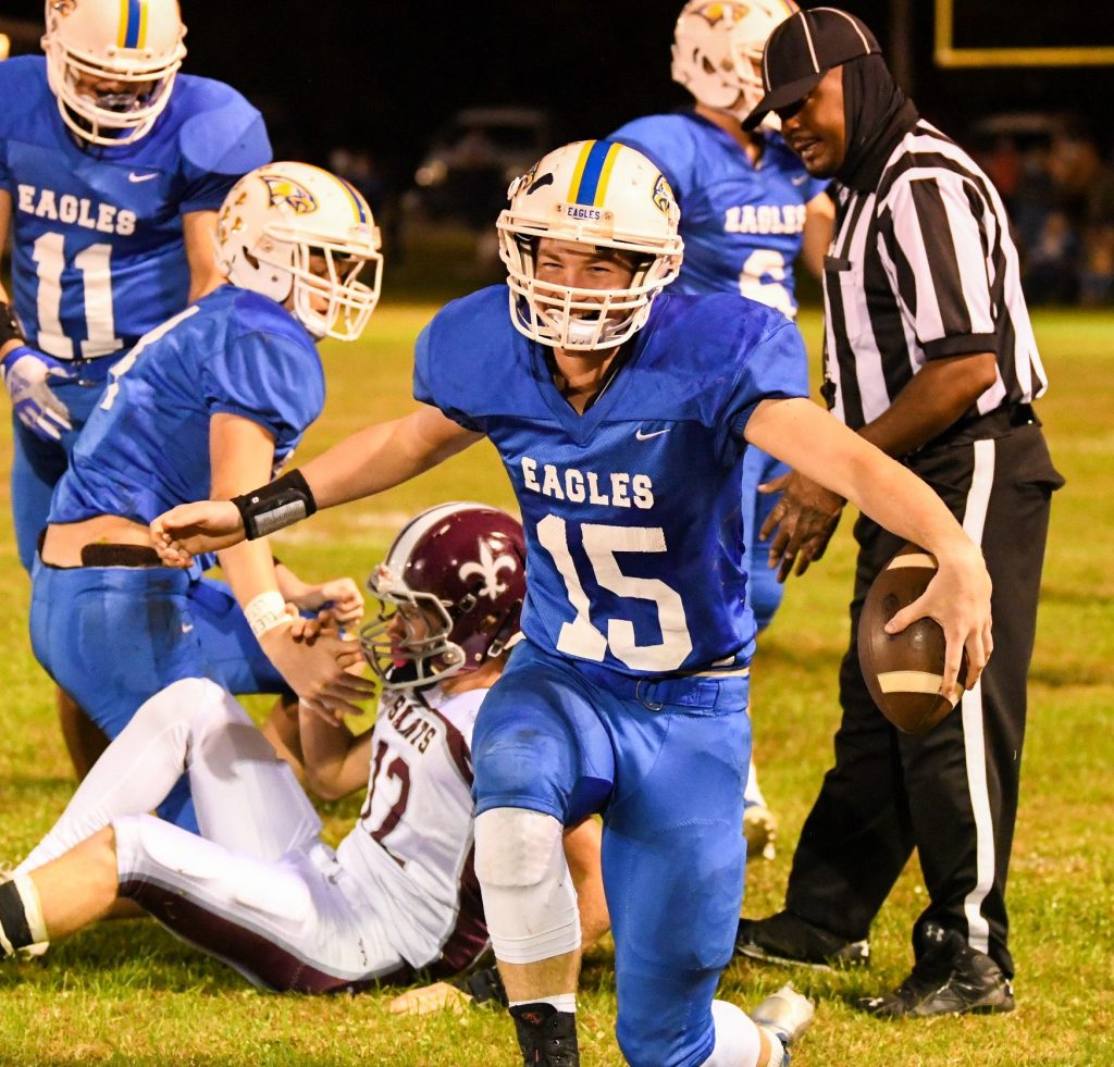 WINNSBORO – B Baker and Zack Taylor combined to rush for 381 yards and seven touchdowns as the Richard Winn Eagles rallied in the second half to defeat the Clarendon Hall Saints by a 52-30 score on Friday evening. The Eagles allowed 30 first half points and trailed 30-24 at the half before outscoring Clarendon Hall 28-0 in the second half.