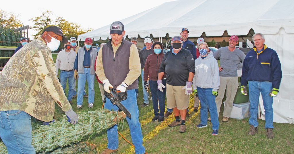 BLYTHEWOOD – Hundreds of Douglas Firs arrived Monday at the Blythewood Rotary Club’s new Christmas Tree sales lot on Blythewood Road across from Palmetto Citizens Credit Union. About 20 Rotarians unloaded the trees, then set them up for display after the tree trunks were trimmed by members John Hancock, left, and Dennis Ballentine.