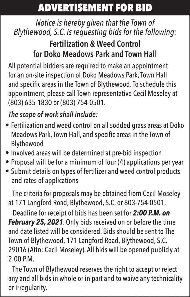 Advertisement for Bid: Town of Blythewood Fertilization & Weed Control
