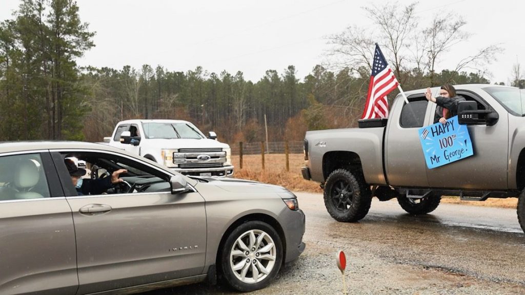 LAKE WATEREE – It may have rained during the parade, but it didn’t rain on his parade. George Alexander celebrated his 100th birthday with a surprise parade from friends and family at Lake Wateree. Above left, Alexander enjoys his celebration despite the cold and rainy weather. Above right, Mayor Joseph Rawl, US Army, Retired, salutes Alexander. Pictured below, Alexander waves to parader Kerrigan Fite.