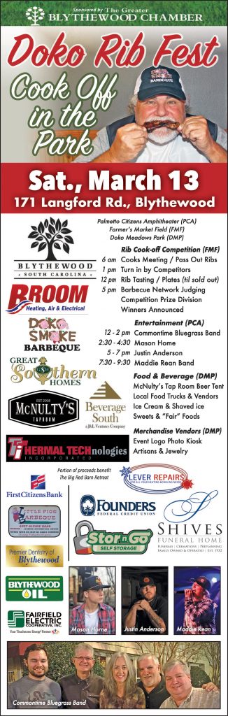 BLYTHEWOOD – The second annual Doko Rib Fest Cookoff, sponsored by the Town of Blythewood will be held this Saturday, March 13, in Doko Meadows Park
