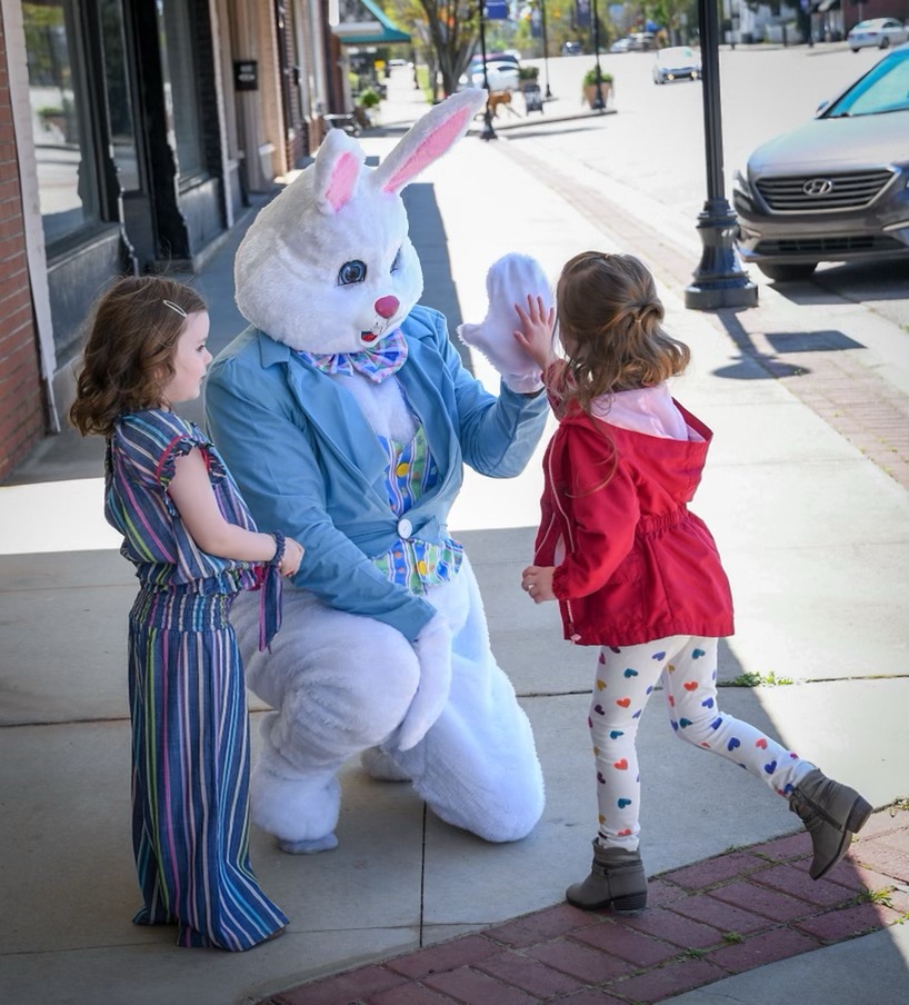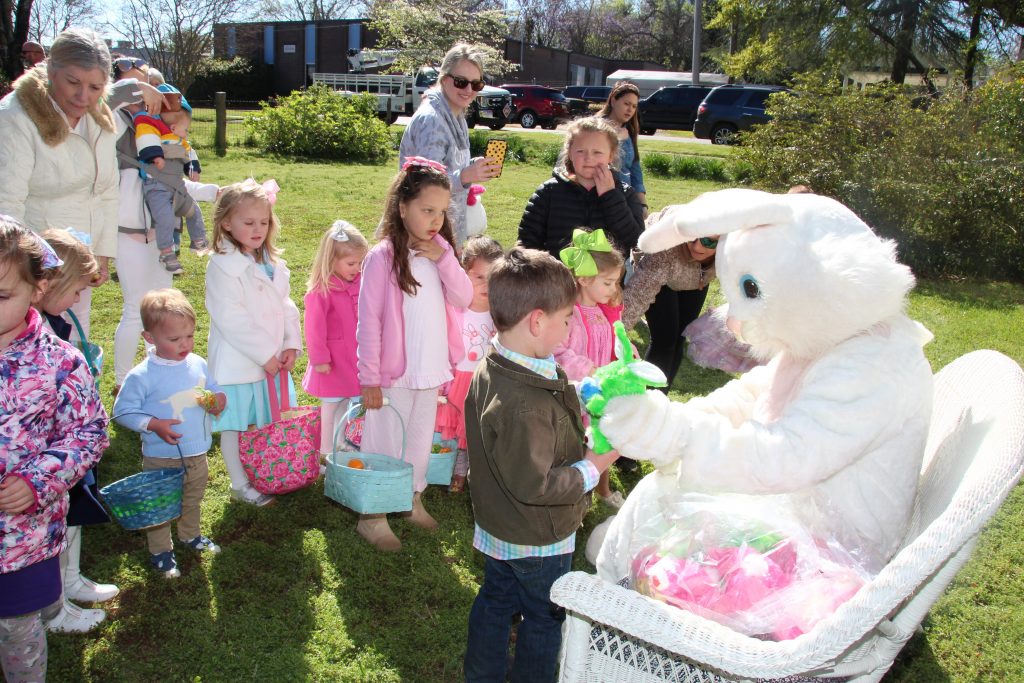 WINNSBORO – The Easter Bunny was out and about in Winnsboro on Saturday. Pictured left, the Easter Bunny visits with kids outside of To Be Stitched, where photographer Millie Lambert held a photo session for Saturday shoppers. At right, children at First United Methodist Church’s egg hunt receive stuffed bunnies from the Easter Bunny, sponsored by the Fairfield County Sheriff’s Department.