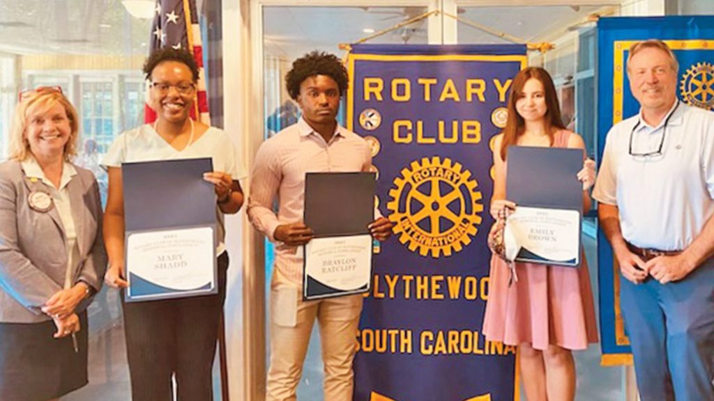 BLYTHEWOOD – Blythewood Rotary Club recently awarded four $2000 scholarships to local Blythewood students. Pictured above, from left, are Scholarship Chair Marha Jones, recipients Mary Shadd, Braylon Ratcliff, Emily Brown and Rotary president Mark Wickham. Not pictured is recipient Justin Kemp.