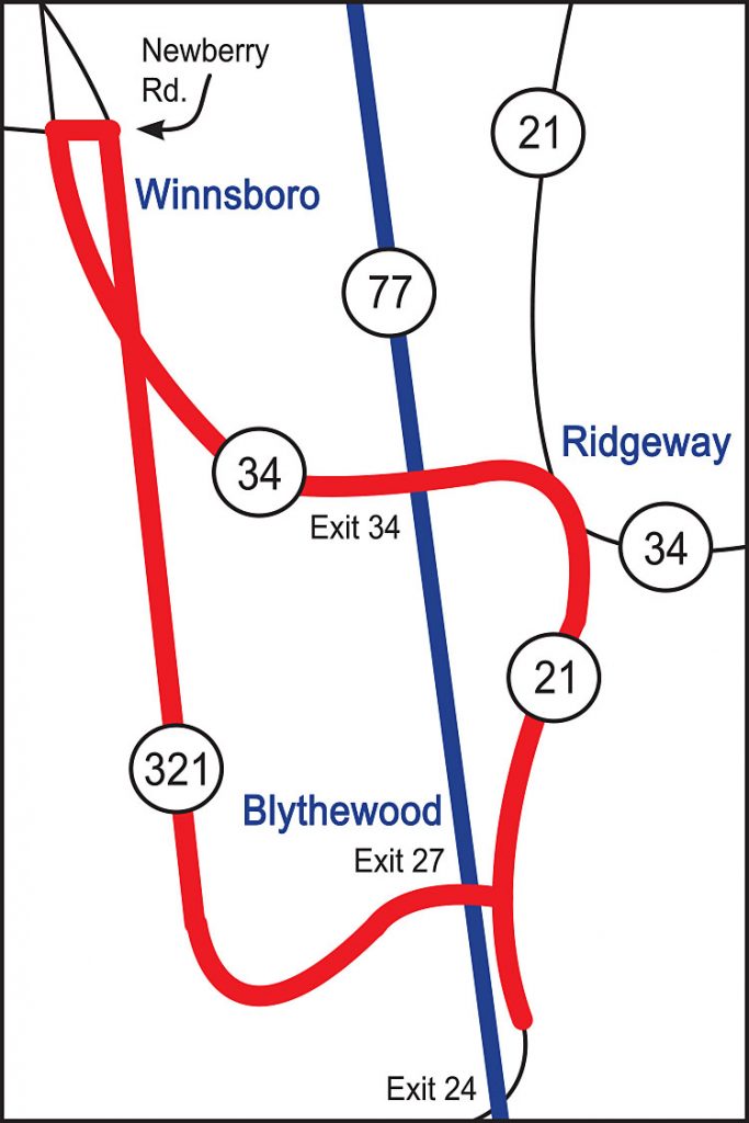 The shopping crawl is a figure 8 loop that extends up Hwy 21 from Blythewood to Ridgeway, then along Highway 34 to Winnsboro where vendors will be set up along the Highway 321 Bypass, Highway 200 and through downtown Winnsboro back to the Bypass and back to Blythewood via Highway 321 to Cedar Creek and then to Blythewood Road.