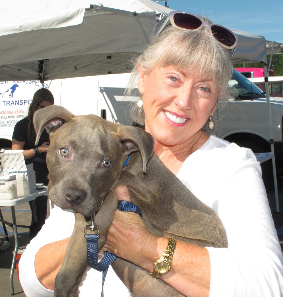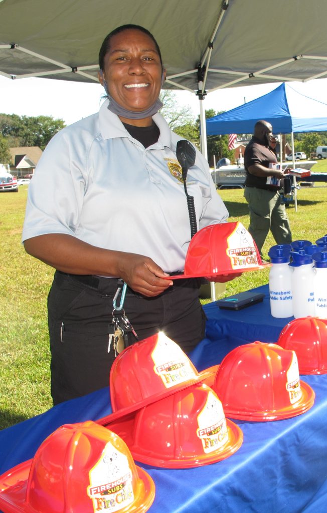 WINNSBORO – Fairfield County departments set up on Saturday at Drawdy Park for a fun community day. Pictured above, Lucas Vance, back left, interim director of County Recreation with members of his staff. Pictured below, Councilman Neil Robinson presents dog food to Jane Ellenburg and her dog Buttercup. At right, Hoof and Paw president Kathy Faulk and member Deborah Richelle.