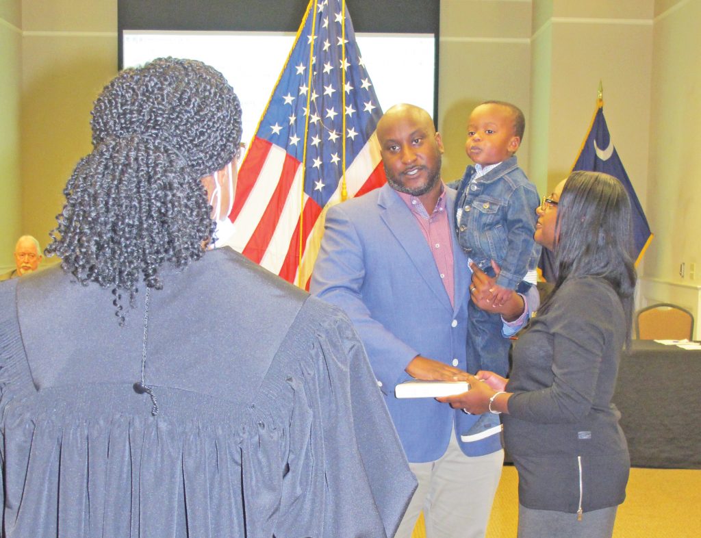 Blythewood Magistrate Diedra Hightower administered the oath of office to returning Blythewood town council member Sloan Griffin, III, left, with his wife Tinnelle and their son Tristan, and to newly elected council member Rich McKenrick, right, with his wife Theresa.