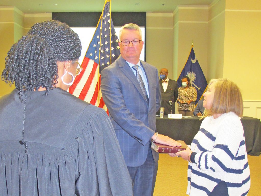 BLYTHEWOOD – After warm goodbyes all around to Councilman Larry Griffin, who has served on town council for six years, Blythewood Magistrate Diedra Hightower swore in Sloan Griffin and Rich McKenrick.