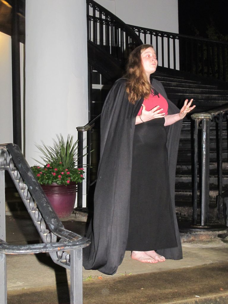Becky Koeller appeared as Mary Ingleman who had been tried in 1789 for being a witch. She stood only feet away from the tree where she had been tortured and burned by her prosecutors.