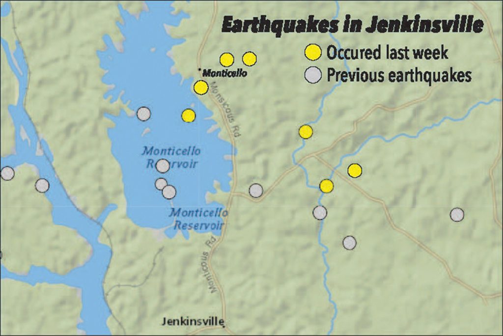 Jenkinsville is located in the southwest corner of the county, near Lake Monticello and the V.C. Summer nuclear site. The minor tremors have all been located around the Monticello reservoir near Jenkinsville.