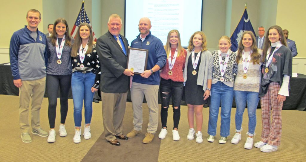 BLYTHEWOOD – Blythewood High School’s newest State Champions, the girls golf team, were honored at Monday’s Blythewood Town Council meeting. Head coach Jason Minkle was presented a plaque from Mayor Bryan Franklin, picturd center. The Bengals took the 5A state title on Oct. 26.
