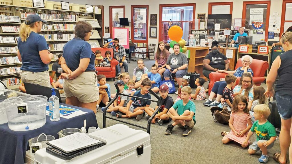 WINNSBORO – Aquarium Rovers visited the Fairfield County Library on Friday, July 8. Aquarium Rovers is an educational outreach program by the South Carolina Aquarium that brings interactive learning through engaging activities, including wildlife artifacts and live animals. The event was a part of Fairfield County Library’s Summer Reading Program.