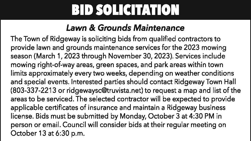 Bid Solicitation: Town of Ridgeway Lawn & Grown Maintenance