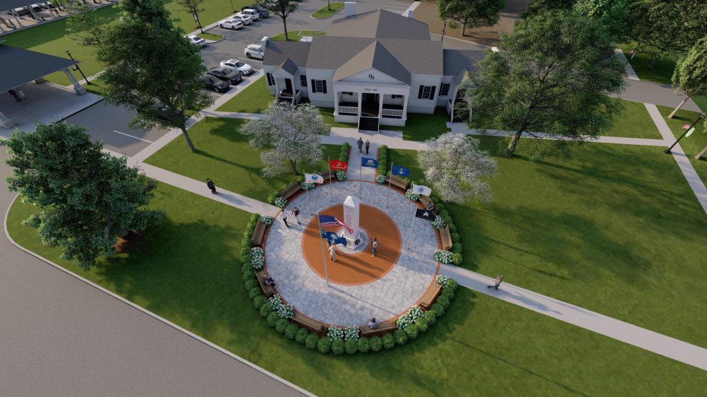 A rendering of the memorial prepared by LandPlan South shows the monument surrounded by an American flag and six smaller service flags representing the six branches of the armed forces. Lomas said the smaller flags could be removed and the poles stored for certain occasions, or could be left up year-round.
