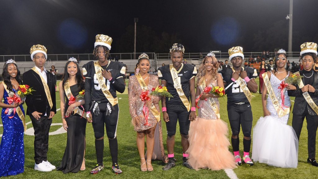 Pictured from left: Senior Princess J’Neisha Gibbs, Senior Prince Akeem Davis, Junior Princess Mikiah Jennings, Junior Prince Jalen Swilley, Homecoming Queen Kenya Davis (pictured center), Homecoming King Curtis Sampson (pictured center), Sophomore Princess Mykiah Sampson, Sophomore Prince Steven Gadsden, Freshman Princess Mariya Lyles and Freshman Prince Chantz Hemphill.