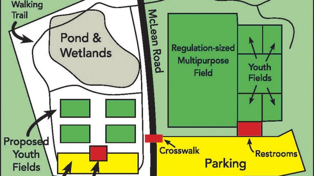 A crosswalk will connect the current fields to the newly purchased property across McLean Road where there will be four youth fields, a restroom and parking.