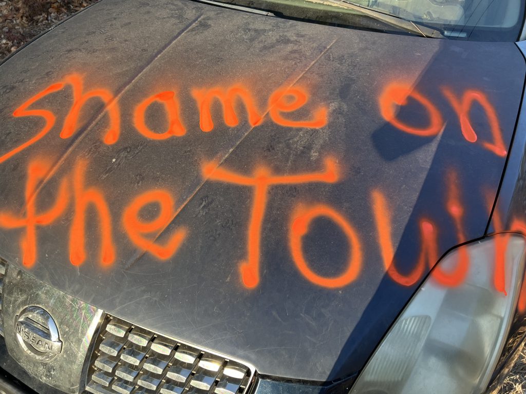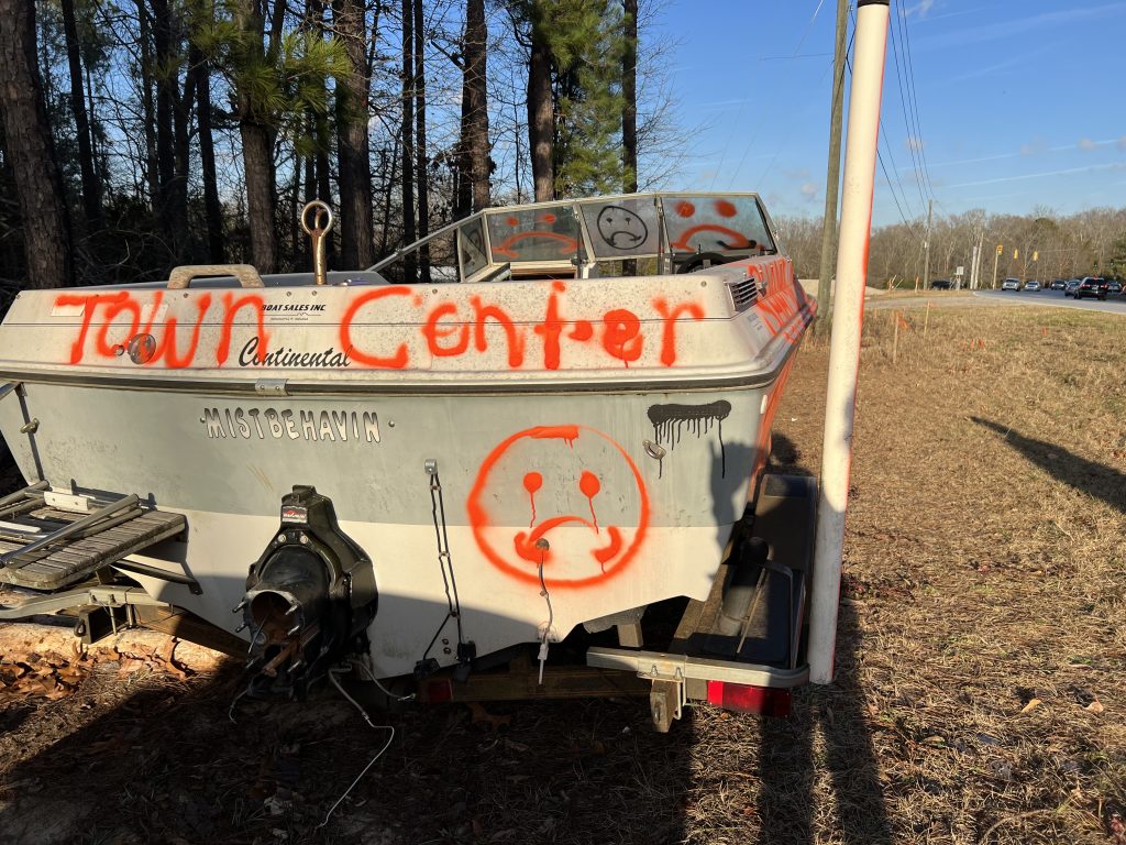 The Voice arrived at the property a few minutes later and saw several vehicles and a boat lined up along Blythewood Road near the property where the natural gas tank had recently been constructed. The words “Town Center” were scrawled across the back of the boat in bright orange spray paint. Other orange messages on the vehicles included “Welcome to Blythewood,” “Bias Politics,” “Who is your mayor?” “Shame on the Town,” and “What’s good for the goose…”