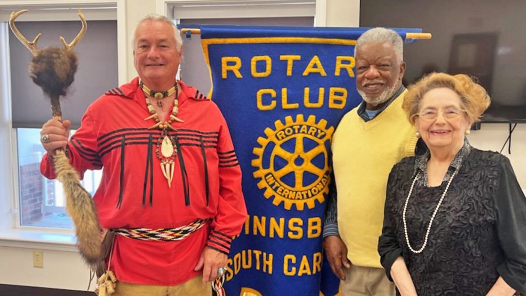WINNSBORO – The Winnsboro Rotary Club held its first meeting of the new year on Tues., Jan. 3. Above, club president Arthur Lathan, center, welcomes Winnsboro resident, Mark Williams, left, a member of the Lower Eastern Cherokee Nation of South Carolina, to talk about his work with his tribe and tribal traditions. Williams serves as both the War Chief and the Fire Keeper for his tribe.