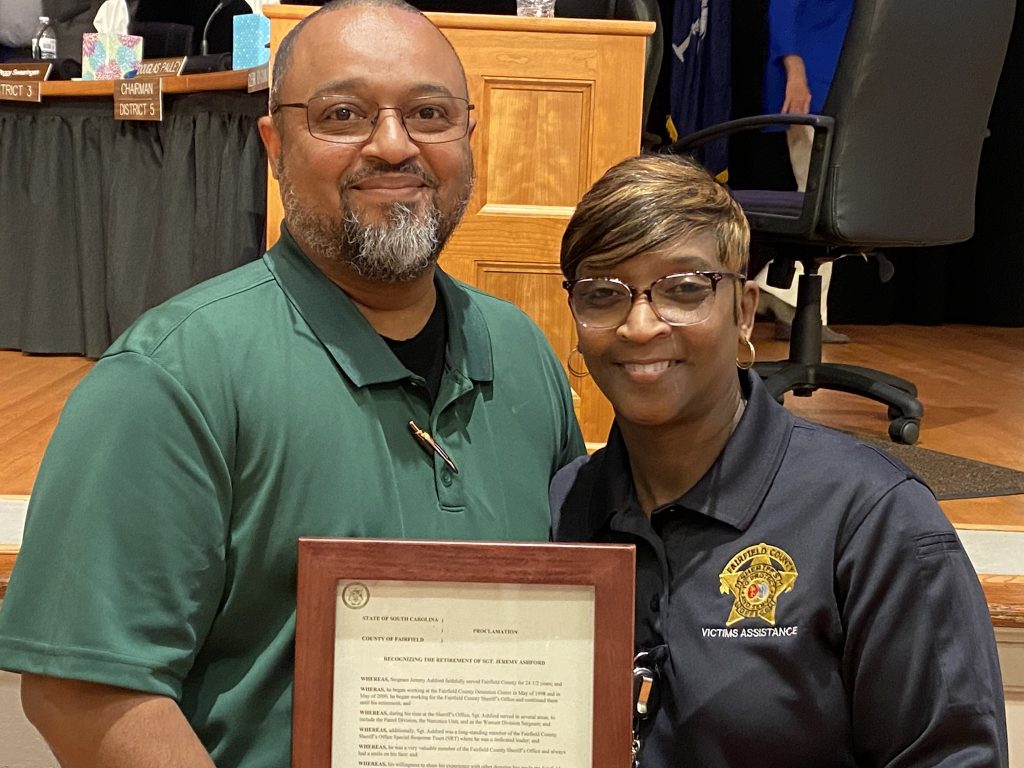 Ashford served Fairfield County for 24 1/2 years. He began working at the Fairfield County Detention Center in May 1998. In May 2000, he transitioned to the Fairfield County Sheriff’s Office and continued there until his retirement in Nov. 2022.