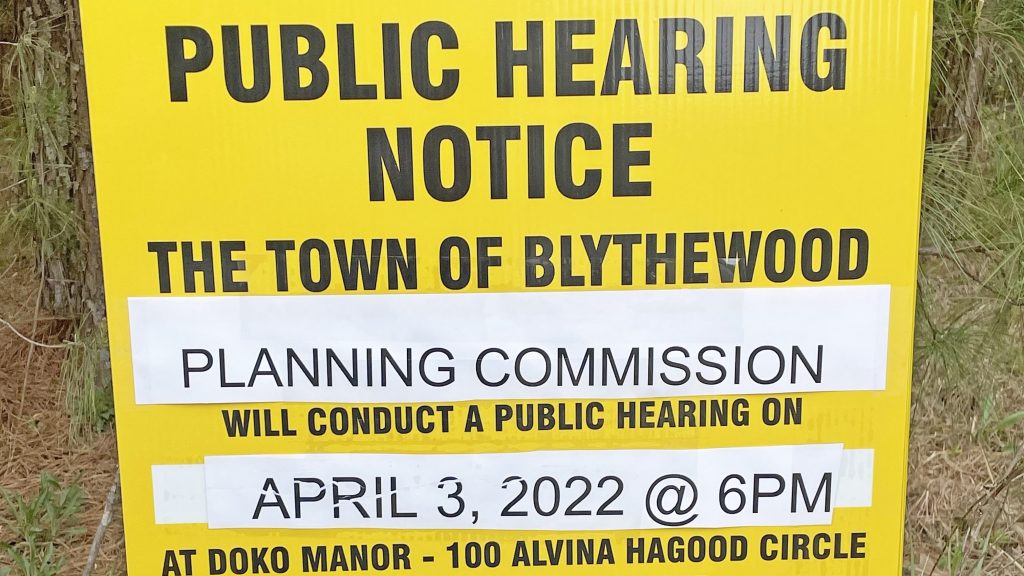 BLYTHEWOOD – Some Ashley Oaks residents say they were alarmed last week when the Town of Blythewood posted a yellow notice near their properties announcing that the owner of a 290.3-acre parcel bordering their back yards is requesting to have the property rezoned from D-1 (Development) zoning to Li-2 (Light Industry-2) zoning.