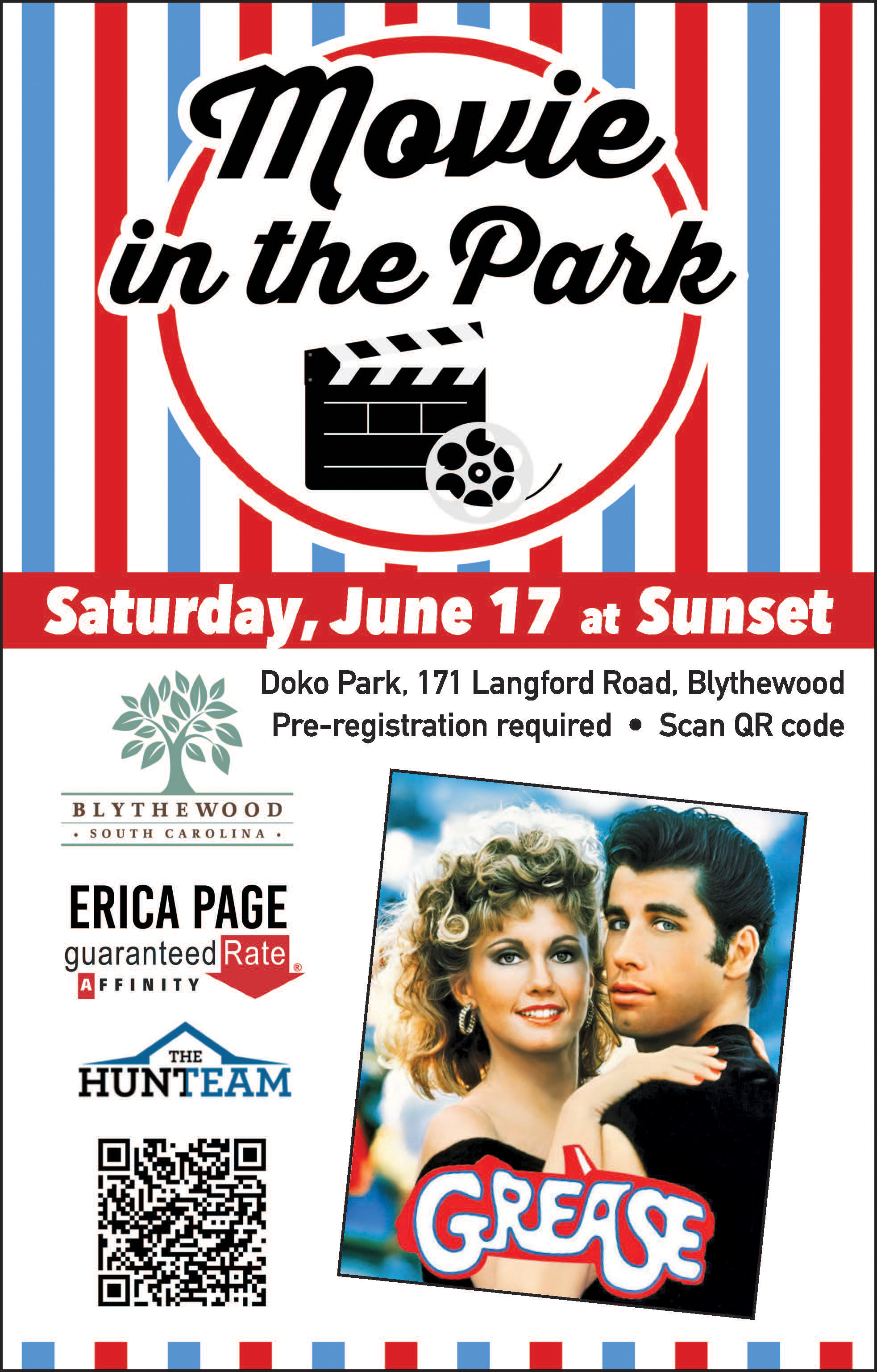 Movies in the Park are sponsored by the Town of Blythewood and Erica Page/ Guaranteed Rate Infinity.