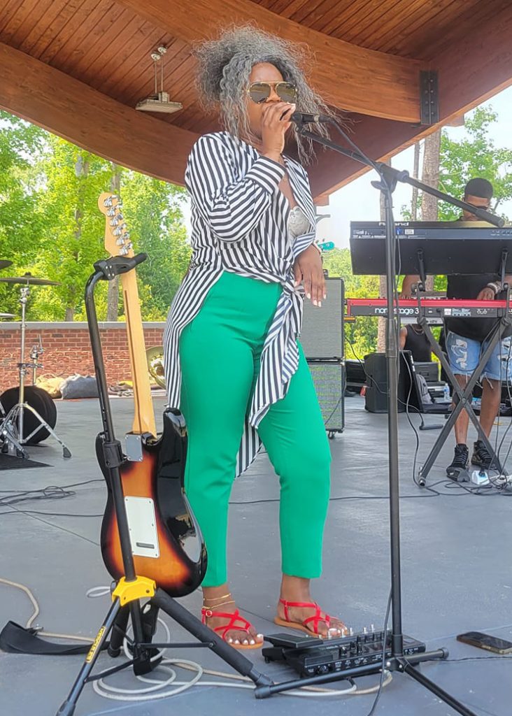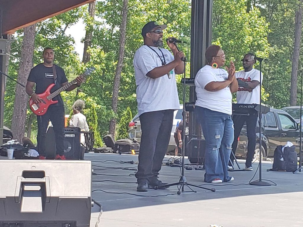BLYTHEWOOD – John Edwards, right, one of the organizers of Saturday’s second annual Juneteenth celebration in Doko Park, is shown here with soulful singer-songwriter “Katera on the Mic” of Columbia, who performed on the amphitheater stage along with other musicians.