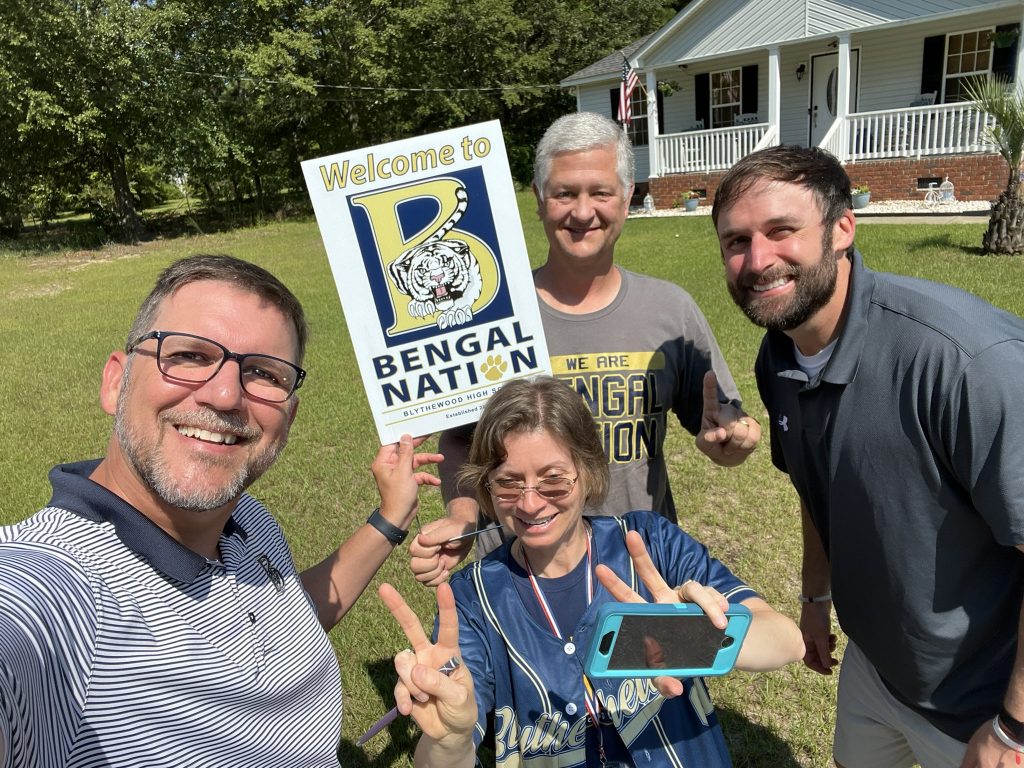 Below left, Blythewood Middle School; at right Blythewood High School teachers place ‘Welcome to Bengal Nation’ signs in freshmen yards, an annual first-day tradition. Students in Richland 2 head back to school on Tuesday, August 8.