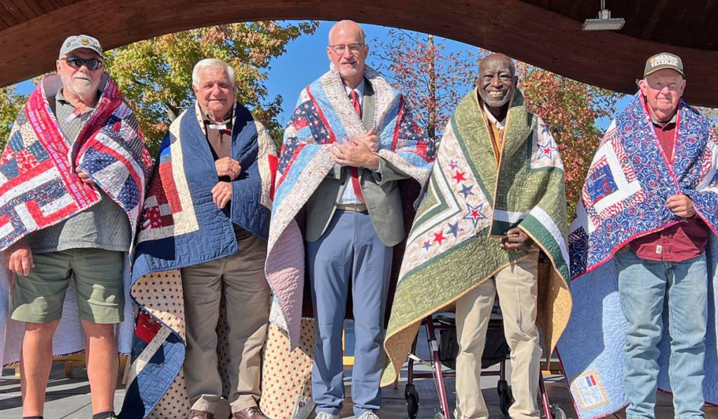 Quilts of Valor were presented to five veterans during the Nov. 4 Veterans’ Day Ceremony in Doko Meadows Park. They are Army veterans Stephen Ray Smith, Coley Richardson, Mike McMaster, Willie Grate, and Marine veteran Gene Belk.