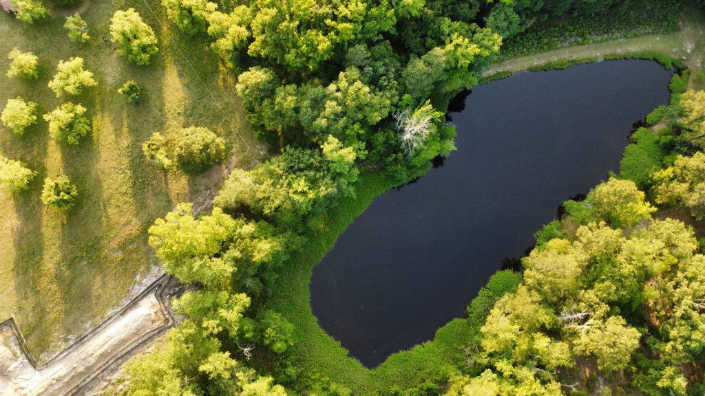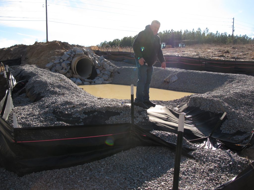Dinkins says the assistant project manager was initially responsive to his complaint. That’s when the small gravel retention pond was constructed on the neighboring property. But the retention pond filled and overflowed quickly – within 24 hours of construction. And the problematic stream of drainage water continued to flow downhill, directly into Dinkins’ pond.