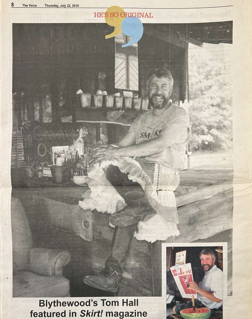 In July of 2012, Hall was featured on the back of Charleston based Skirt! Magazine. In the photo, he was sitting on the outdoor bar of his Blythewood restaurant, wearing tall boots, a Smoke Southern BBQ t-shirt and a skirt with an eyelet ruffle. The photo also appeared in The Voice along with a photo of him sitting on the same bar eating watermelon and reading a copy of Skirt!