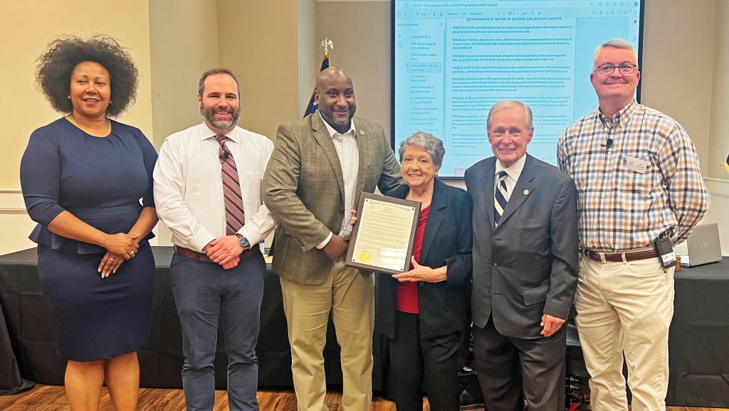 BLYTHEWOOD – Bill and Barbara Shives, center, longtime Blythewood residents and founders of Shives Funeral Home and Bibi’s Kennels, were recognized at the Monday night town council meeting for their many contributions and dedication to the Blythewood community.