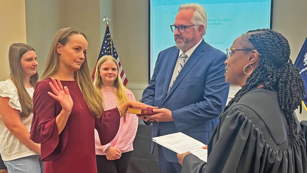 BLYTHEWOOD – Erica Page, the town’s newest town council member, was administered the oath of office by Judge Deirdre Hightower Monday night as her family looked on.