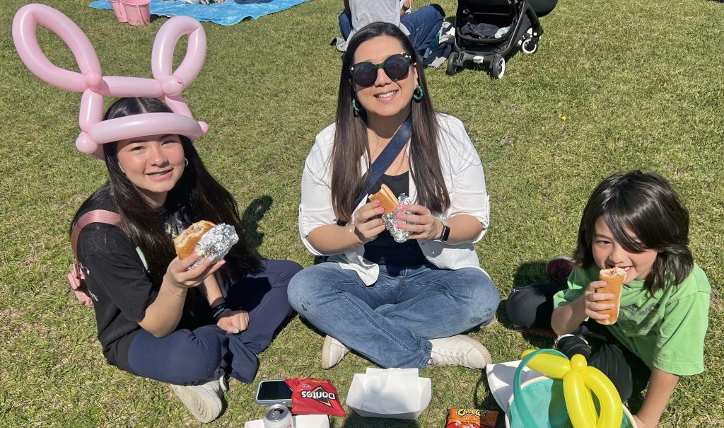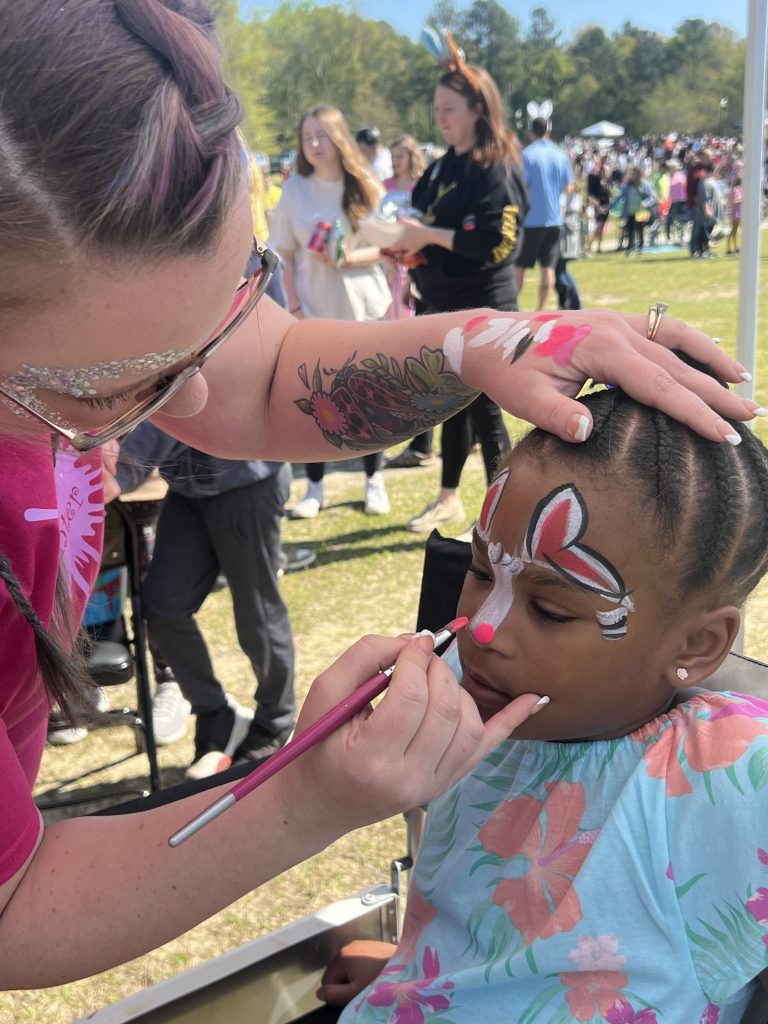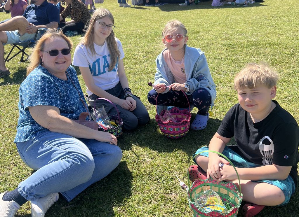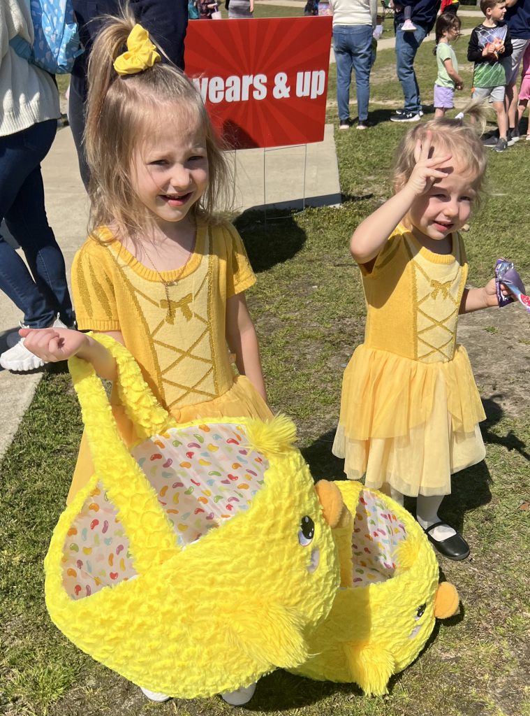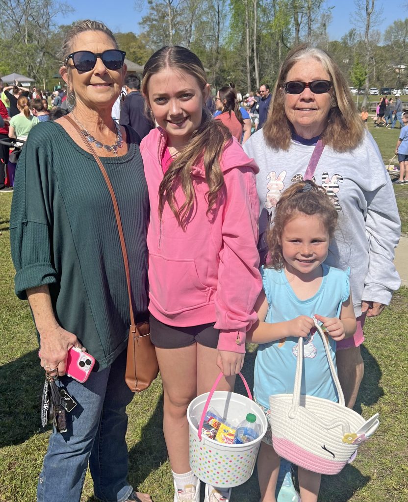 BLYTHEWOOD – On a bright sunny Saturday, sisters Madison, Aleah, and Emma Dawkins pose for a photo with the Easter Bunny following the Village Church’s annual Easter Eggstravaganza at Doko Meadows Park last weekend.