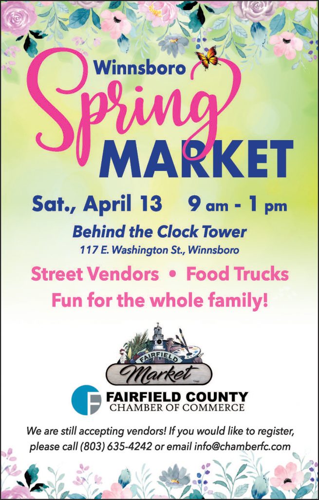 WINNSBORO – Downtown Winnsboro will be hopping the weekend of April 13 with the Fairfield Farmers and Artisans Market joining forces with the Fairfield County Chamber of Commerce for a Spring Market event. There’ll be food trucks and vendors galore – plus, the stores along Congress Street will be stocked for spring.