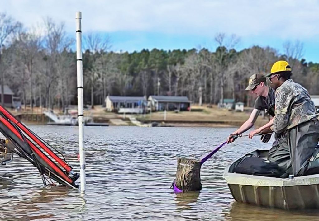 Helping to install the fish habitat are Lake Wateree Assoc. officers (l-r): Chairman Tommy Fort and First Vice-Chair Rod Wilkes. Behind them are members of the USC Bass Fishing Team Fisher Rodgers (left) and Lucas Bowers. | Contributed