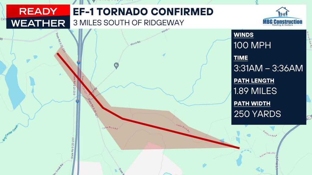 Another, larger tornado in Fairfield County, determined to be an EF-1 tornado, occurred at 3:31 a.m. and ended five minutes later at 3:36 a.m., traveled over a 250-yard wide path for 1.89 miles, along Cedar Rock Road – between Hood Road and The Farm at Ridgeway – with winds peaking at 100 miles per hour.
