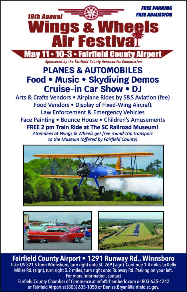 For more information, contact Fairfield County Chamber of Commerce at [email protected] or 803-635-4242 or Fairfield Airport at 803-635-1058 or [email protected].