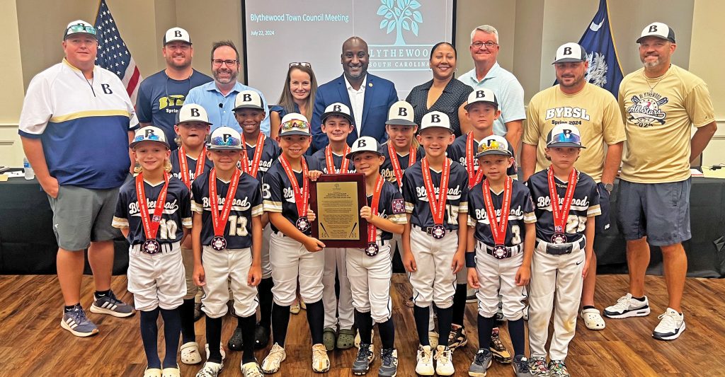 BLYTHEWOOD – Blythewood Town Council members honored Blythewood Youth Baseball League’s Coach’s Pitch All-Star team Monday night following the team’s state championship win in the Diamond Youth Baseball (DYB, formerly the Dixie Youth) in Walterboro earlier this month. They begin play as South Carolina All-Stars in the DYB World Series this weekend in Orangeburg.