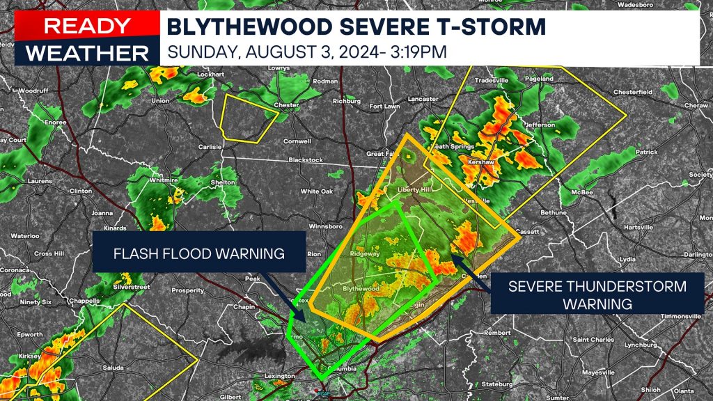 Light showers started to develop southwest of Blythewood at 1:45 p.m. and quickly blew up into a severe thunderstorm by 2:30 p.m., producing 60 mile per hour winds and rainfall rates up to 5 inches per hour.
