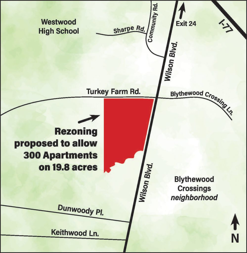 COLUMBIA – The Richland County Planning commission heard a request Monday night, Dec. 2, for a rezoning that would allow as many as 300 apartment units on almost 20 acres located on Wilson Boulevard immediately south of Turkey Farm Road. The address of the 19.8-acre property is 10141 Wilson Boulevard (TMS # R14800-05-11).
