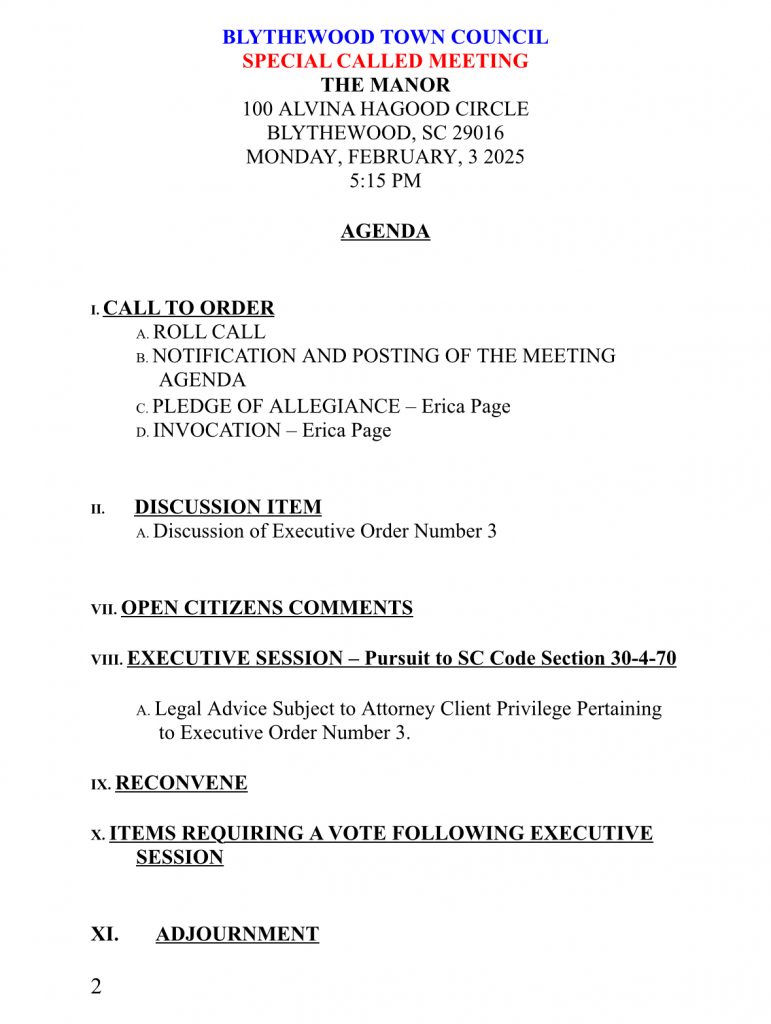 “I am writing to formally inform you that, pursuant to the Attorney General’s Opinion, I have issued Executive Order No. 3, which reinstates previously defunded and eliminated administrative positions within the Town of Blythewood, effective Tuesday, February 4, 2025,” Griffin wrote in the Executive Order.