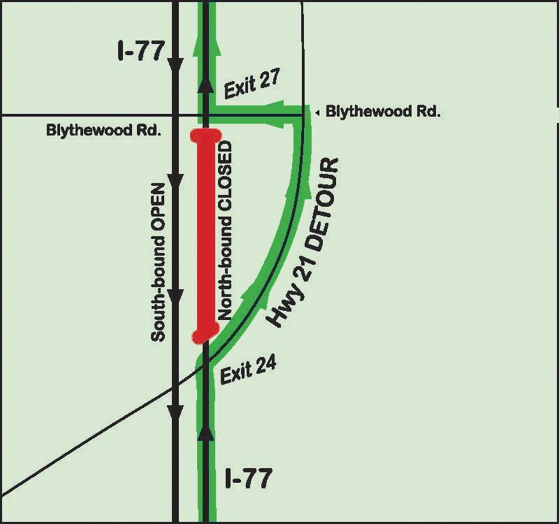As part of these closures, a signed detour route will be put in place. Drivers will take Exit 24 and turn right on to Wilson Boulevard (US 21) and then turn left on to Blythewood Road where they will re-enter I-77 Northbound.