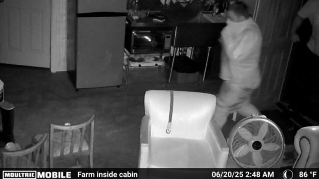 According to a report, around 2:47 a.m., two individuals were captured on camera entering the home—one had their face covered while the other stood in the doorway.