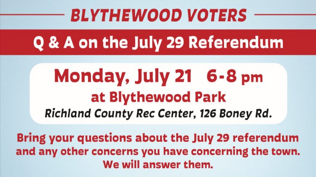 BLYTHEWOOD – Mayor Pro Tem Donald Brock, Councilman Rich McKenrick, and Councilwoman Andrea Fripp will host a meeting for Blythewood voters on Monday, July 21, to answer questions regarding the upcoming July 29 referendum.