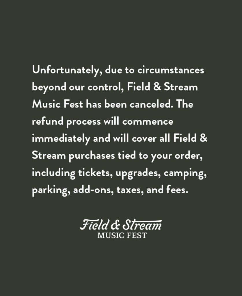 “Unfortunately, due to circumstances beyond our control, Field & Stream Music Fest has been canceled,” the statement read. “The refund process will commence immediately and will cover all Field & Stream purchases tied to your order, including tickets, upgrades, camping, parking, add-ons, taxes, and fees.”