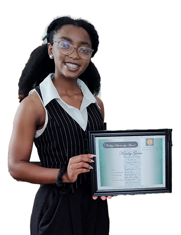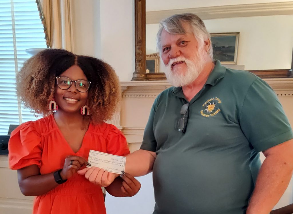 WINNSBORO – Fairfield County Genealogy Society presented $1,000 scholarship on Monday, Oct. 6, to the Society’s 2025 winners, Jazmin Goodwin, pictured above with Eddie Killian, Director of Genealogy Research, and Kenley Green, left.