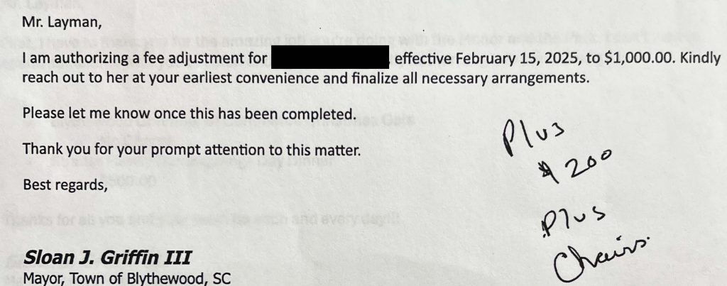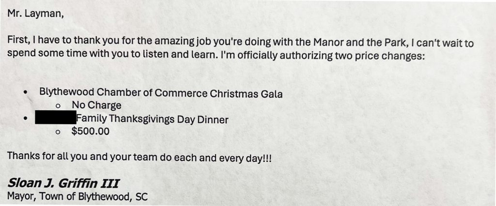 In an email dated Nov. 12, 2024, Griffin wrote to Layman: “First, I have to thank you for the amazing job you’re doing with the Manor and the Park …I’m officially authorizing two price changes: Blythewood Chamber of Commerce Christmas Gala – No Charge – and a Family Thanksgiving Day Dinner reservation – $500.”