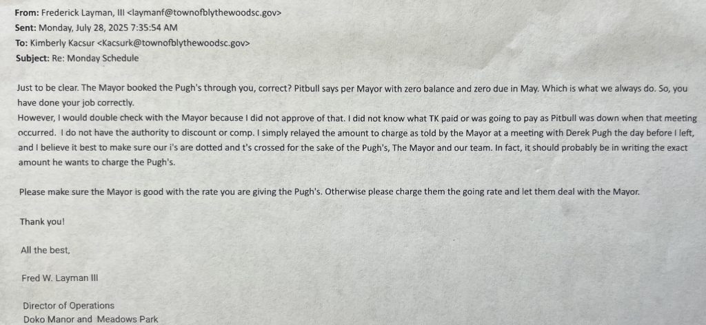 “However, I would double check with the Mayor because I did not approve of that. I did not know what [Mrs. Pugh] paid or was going to pay as Pitbull was down when that meeting occurred. I do not have the authority to discount or comp. I simply relayed the amount to charge as told by the Mayor at a meeting with Derek Pugh the day before I left …In fact, it should probably be in writing, the amount he wants to charge the Pughs.”