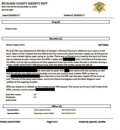 Detectives determined the truck had been stolen out of Charlotte and was used in another ATM theft in that city. The suspects had also ripped the GPS tracking device off the vehicle to avoid detection, the report said.