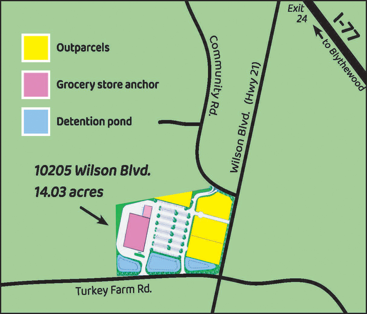 The 14-acre property will be called Blythewood Market Place and is located on Highway 21, between Turkey Farm Road and Community Road. Several outparcels suited for retail, service, and restaurant businesses are also located on the property.